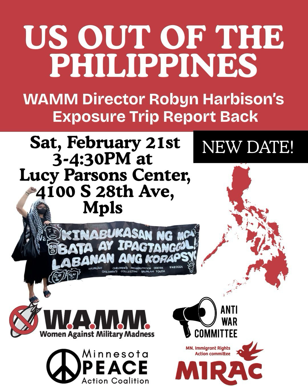 Sunday, February 21st, 3-4:30 pm, Lucy Parsons Center, 4100 28th Ave S, Minneapolis Hear from WAMM Director Robyn Harbison on the details of his exposure trip to the Philippines as a WAMM rep and member of the International Women's Alliance. Endorsed by AWC, MPAC, WAMM and MIRAC