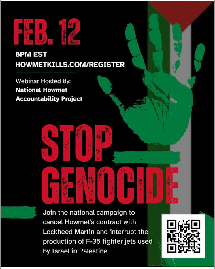 Thursday, February 12, 7 PM CST, Link to register here howmetkills.com/register NATIONAL WEBINAR:  Howmet Aerospace makes parts for Lockheed Martin’s F-35 fighter jet.Their factories are targeted by activists in the UK and across the USA. Come learn how factories in your back yard are contributing to the genocide in Gaza, and how you can help…