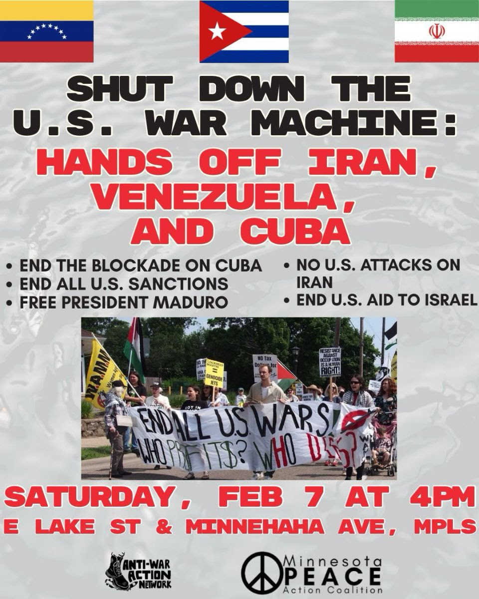 Saturday, February 7, 4 PM, Lake St and Minnehaha Ave, Mpls PROTEST: SHUT DOWN THE U.S. WAR MACHINE! Join the Minnesota Peace Action Coalition Saturday, February 7 to say HANDS OFF IRAN, VENEZUELA, AND CUBA! As Trump’s threats of war escalate, we will be joining the National Day of Action to demand: An end to…