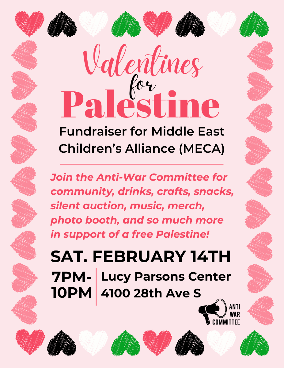 Saturday, February 14, 7 - 10 PM, Lucy Parsons Center, 4100 28th Ave S, Minneapolis, MN Show some love for Palestine with us at our Valentine’s Day fundraiser! Feb 14 7 PM Lucy Parsons Center Come for food, drinks, crafting valentines, and a silent auction, all benefiting the Middle East Children’s Alliance (MECA). MECA is…
