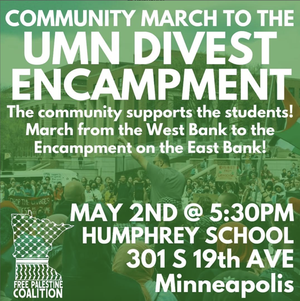 This action was planned in consultation with the student leaders in the UMNDIVEST COALITION, who want as many people as possible to show up at their encampment for the safety of the students there.