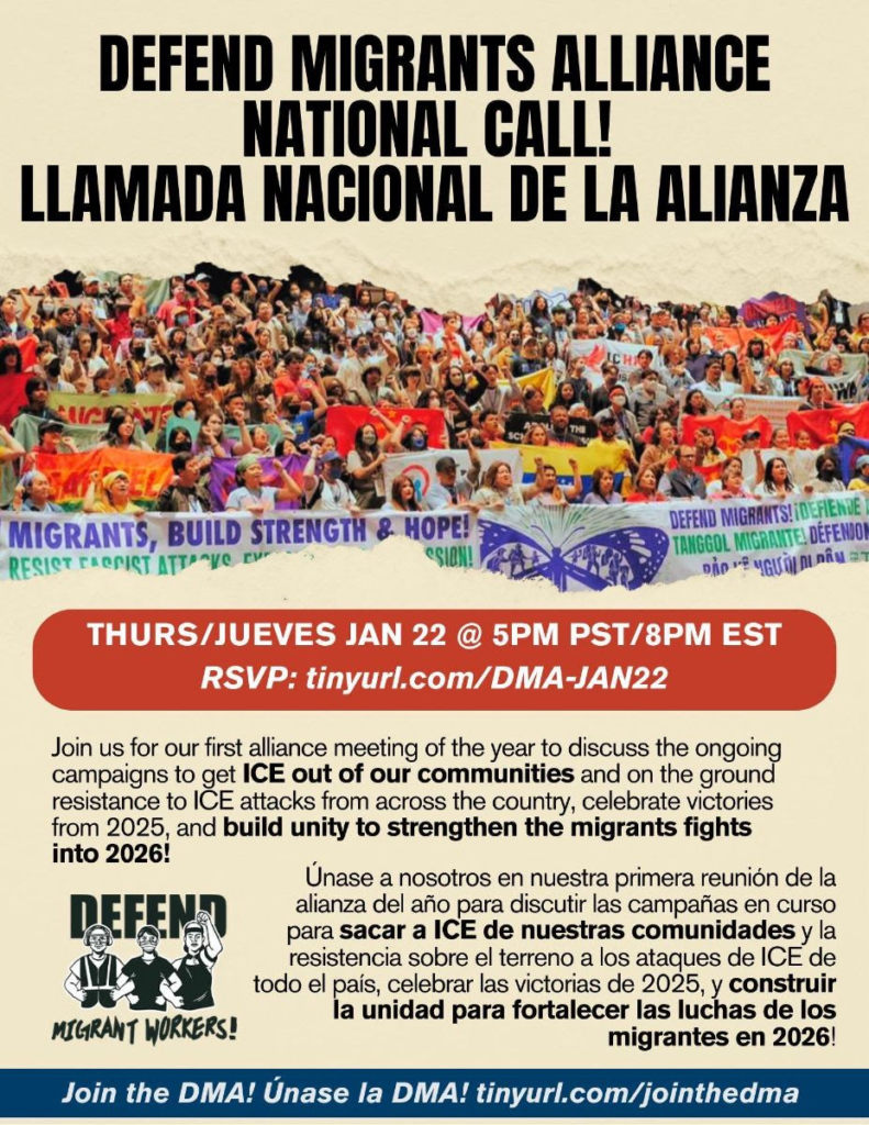 Join us for our first alliance meeting of the year to discuss the ongoing campaigns to get ICE out of our communities and on the ground resistance to ICE attacks from across the country, celebrate victories from 2025, and build unity to strengthen the migrants fights into 2026!