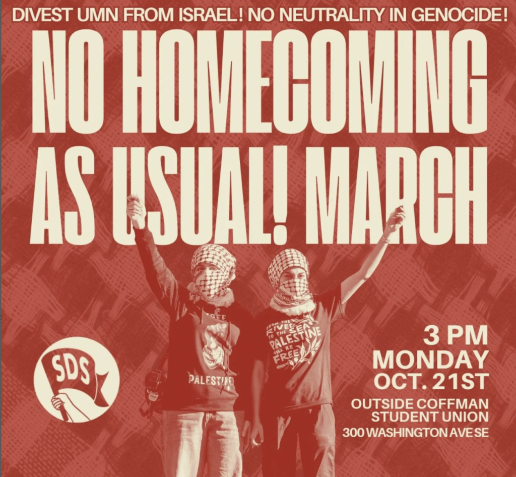 Join us at 3pm on Monday, October 21st to protest UMN’s ongoing financial support of Israel and administration’s continued attacks on academic freedom! There are no universities left in Gaza! No hoco as usual during a genocide!