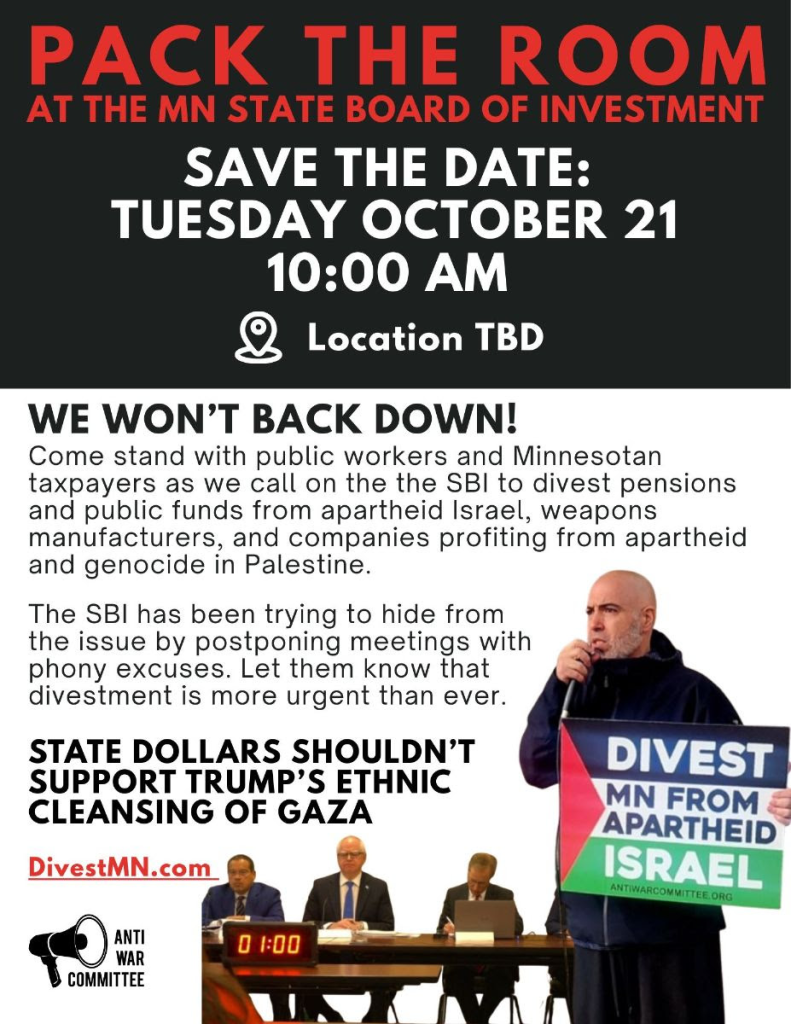 Come stand with public workers and Minnesotan taxpayers as we call on the SBI to divest pensions and public funds from apartheid Israel, wepons manufacturers, and companies profiting from apartheid and genocide in Palestine.