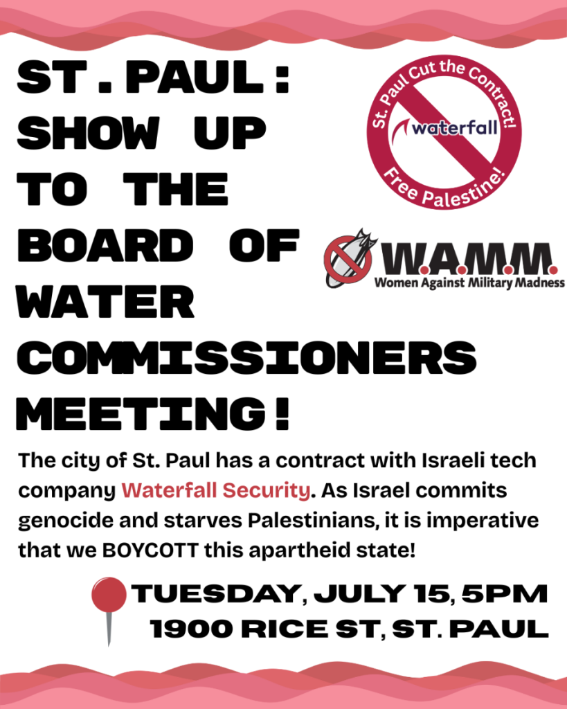 Waterfall Security Solutions is an Israeli company that is in the business of cyber protection. On October 1, 2024, the Saint Paul Board of Water Commissioners entered into a contract with Waterfall to protect the computer network of Saint Paul Regional Water Services. The contract is in the amount $74,000.00. It expires on October 1, 2025.We are now lobbying Saint Paul elected officials. We simply ask that the contract be allowed to expire. We argue that a strategy of economic isolation was successful in dismantling apartheid in South Africa, and is applicable to Israel today given its apartheid history and the determination by the International Court of Justice that Israel is plausibly committing genocide against the Palestinian people in Gaza.To date, we have received no substantive response, so we are intensifying our campaign to dump Waterfall. Come to 1900 Rice St in St. Paul at 5pm Tuesday to tell the Board of Water Commissioners to dump Waterfall!