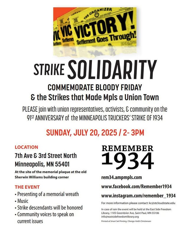 Commemorate Bloody Friday and the strikes that made Minneapolis a Union Town. Please join with union representatives, activists, and community on the 91st anniversary of the Minneapolis Truckers’ Strike of 1934.