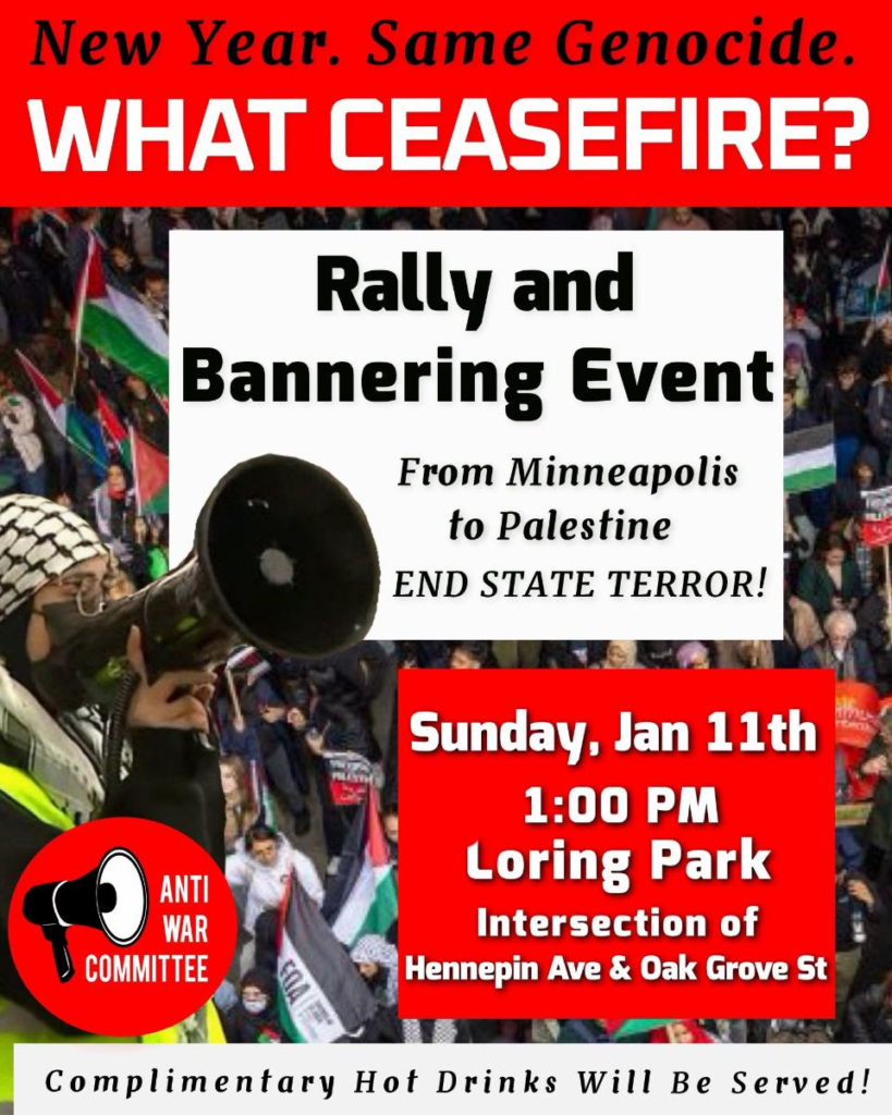 As Trump ramps up ICE attacks on our immigrant communities here in Minneapolis, Israel has continued its attacks on Palestinians in Gaza and the West Bank despite the ceasefire agreement reached in October. Hundreds of Palestinians have been killed since then, and in November the UN Security Council resolution on Gaza was passed, effectively setting the table for Gaza to be turned into a U.S. colony. We say shame to that! We will continue to demand an end to the occupation, and an end to the genocide. We will not stop until Palestine is free!