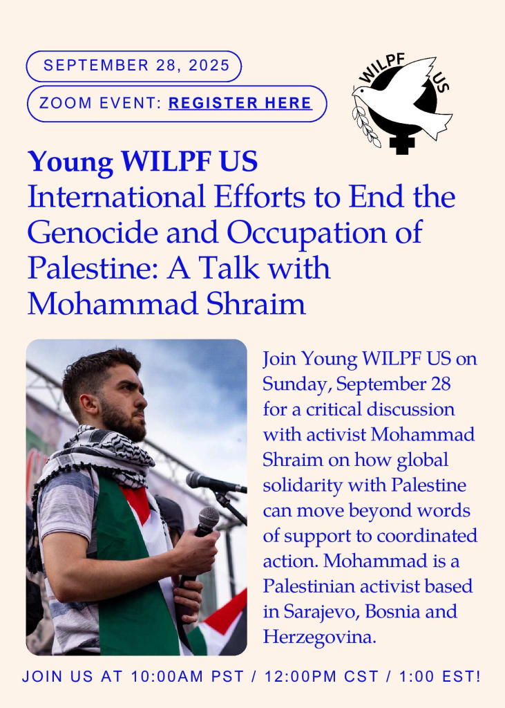 Join Young WILPF US on Sunday, September 28th at 10:00am PST / 12:00pm CST / 1:00 EST for a critical discussion with activist Mohammad Shraim on how global solidarity with Palestine can move beyond statements to coordinated action.
