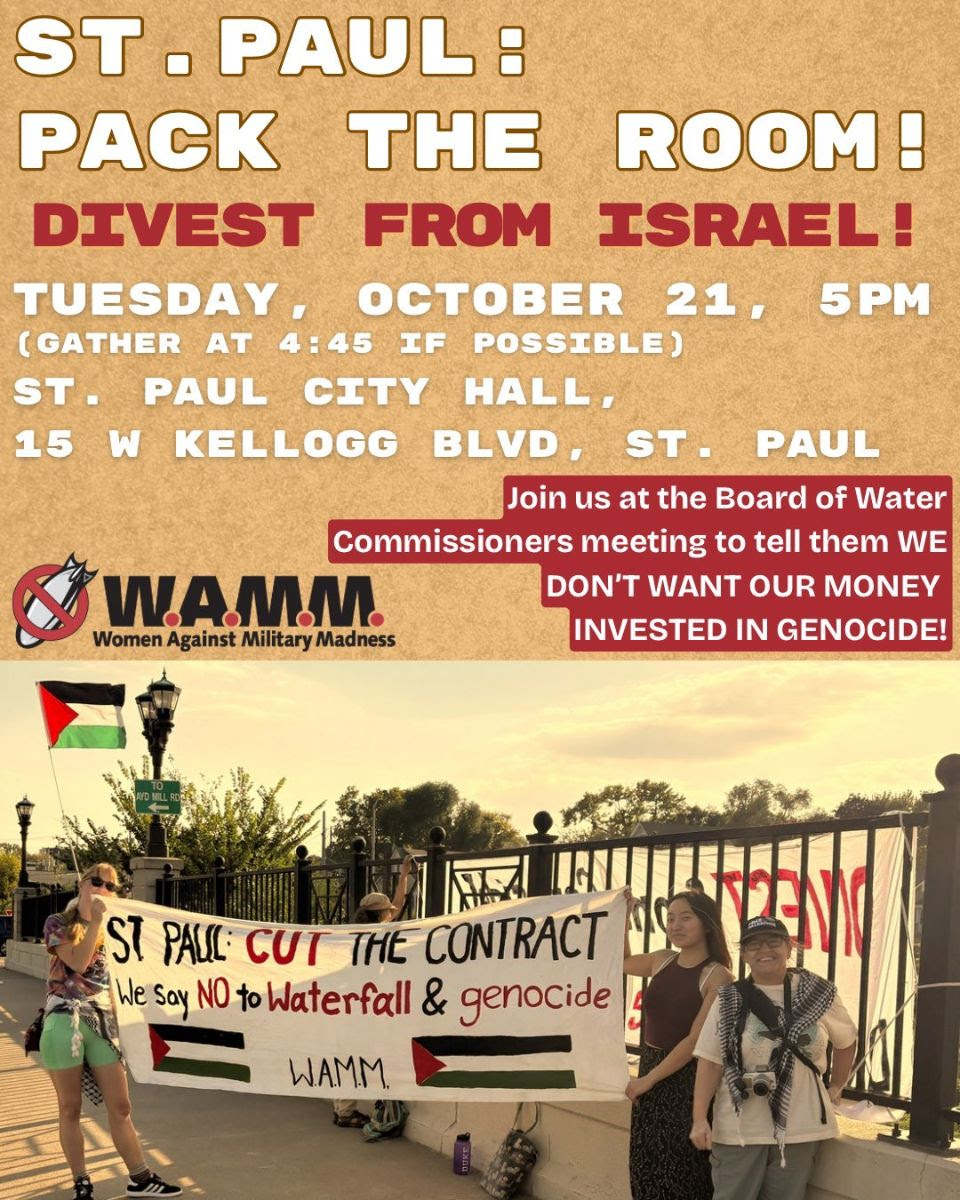 Tuesday, September 9, 2025, 5:00 PM, St Paul City Hall, 15 W Kellogg, St Paul, MN The St. Paul Board of Water Commissioners has moved their meeting location back to City Hall for September. We’ll see you there to demand they DIVEST ST. PAUL FROM GENOCIDE! For multiple months they have ignored our attempts…