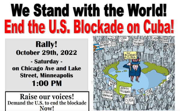 We Stand with the World! End the U.S. Blockade on Cuba! Saturday, October 29, 2022, 1:00 PM Chicago Ave and Lake St in Minneapolis Free Raise our Voices! Demand the…