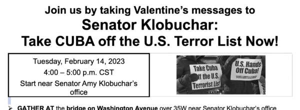 TUESDAY, FEBRUARY 14, 2023 AT 4 PM – 5 PM Celebrate Valentine’s Day! Join us by taking Valentine’s messages to Senator Klobuchar’s office: Time: 4:00 PM Take Cuba off the…
