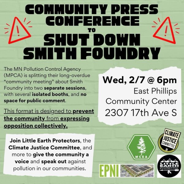 Wednesday, February 7, 2024, 6:00 pm, East Philips Community Center, 2307 17th Ave S The MN Pollution Control Agency (MPCA) is splitting their long-overdue “community meeting” about Smith Foundry into…