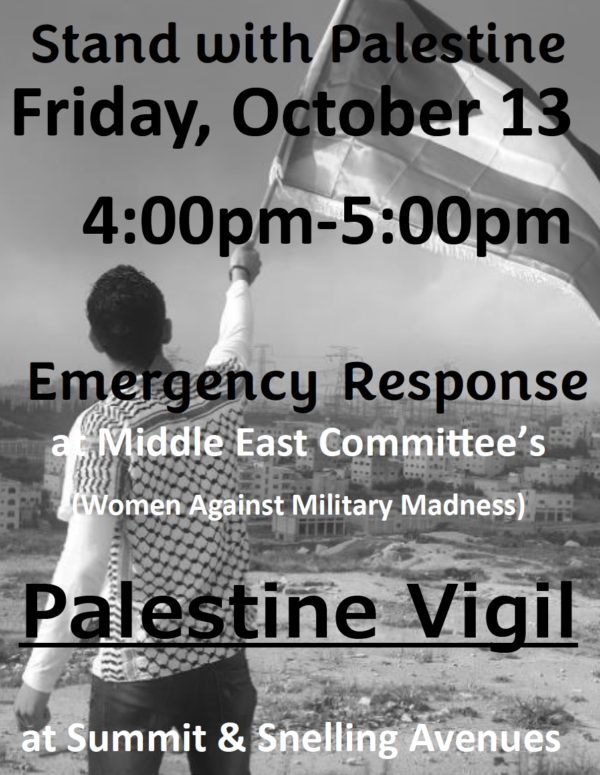 Friday Weekly Palestine Vigil Summit & Snelling Avenues in St. Paul Every Friday from 4:00pm-5:00pm Join us to stand against the brutal and unjust conditions of occupation! Please wear masks…
