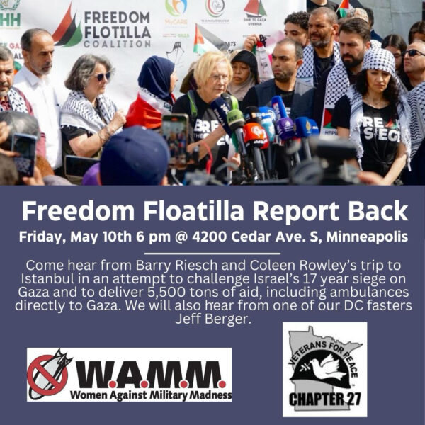 Friday, May 10, 2024, 6:00 pm, 4200 Cedar Ave S, Mpls, MN Come hear from Barry Riesch and Coleen Rowley’s trip to Istanbul in an attempt to challenge Israel’s 17…