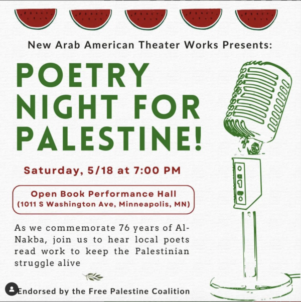 Saturday, May 18, 2024, 7:00 PM, Open Book Performance Hall (1011 S Washington Ave, Minneapolis) New Arab American Theater Works presents: Poetry Night for Palestine! 🇵🇸🙏 As we commemorate 76…