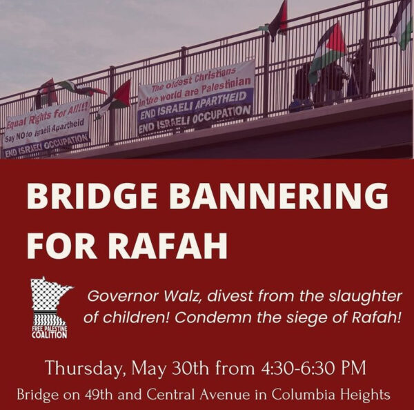 ⏰ Thursday, May 30, 2024, 4:30-6:30 pm 📍Bridge on 49th and Central Ave in Columbia Heights, MN 🚨🚨 Israel has continued to bomb civilians, including those sheltering in tents…