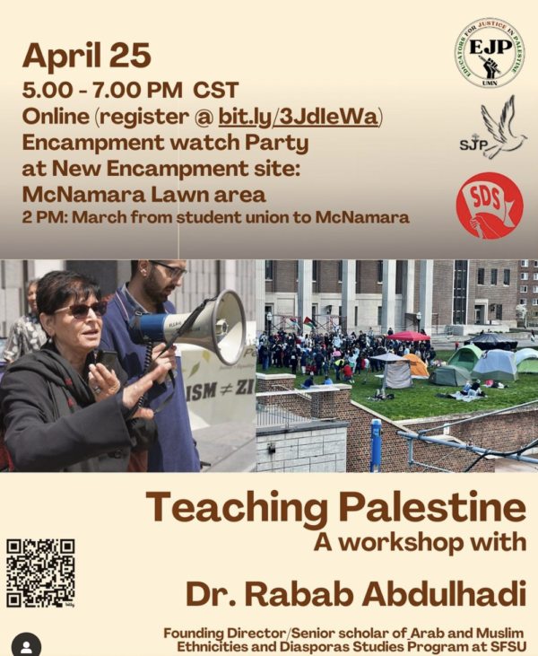 Thursday, April 25, 2024, 5:00 – 7:00 pm, Online, register here Encampment watch party: McNamera Lawn area Join us for an encampment watch party at the New encampment location— McNamara…