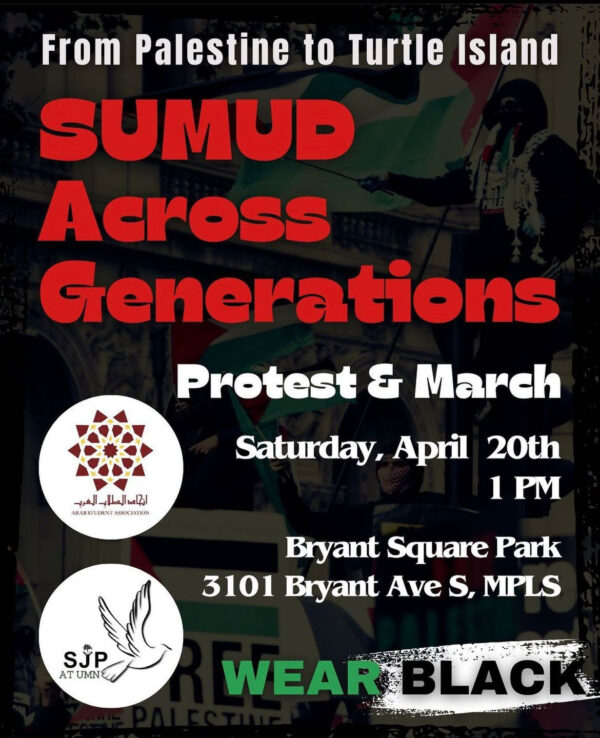 Saturday, April 20, 2024, 1:00 pm, Bryant Square Park, 3101 Bryant Ave S, MPLS ‼️PROTEST AND MARCH‼️ We are calling on ALL people around Minnesota and encouraging ALL students across…