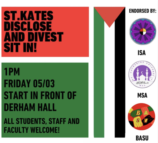 Friday, May 3, 2024, 1:00 pm, Derham Hall, 2004 Randolph Ave, St Paul, MN 55105 All students, staff and faculty welcome! Organized by St Kate’s SJP, MSA and BASU.