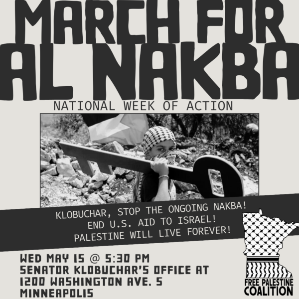 Wednesday, May 15, 2024, 5:30 pm, 1200 Washington Ave S Klobuchar, stop the ongoing Nakba! End US Aid to Israel! Palestine will live forever! Organized by the Free Palestine Coalition