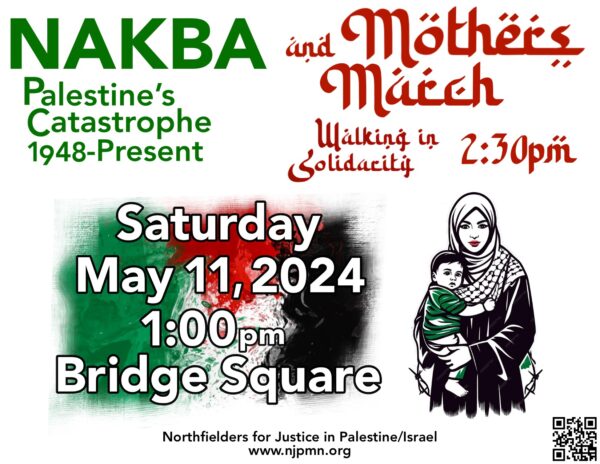 Saturday, May 11, 2024, 1:00 pm, Bridge Square, Northfield, MN 55057 Organized by Northfielders for Justice in Palestine/Israel ~ The Nakba Program ~ Welcome – Fred Rogers Greetings from Ahmed Tharwat of…