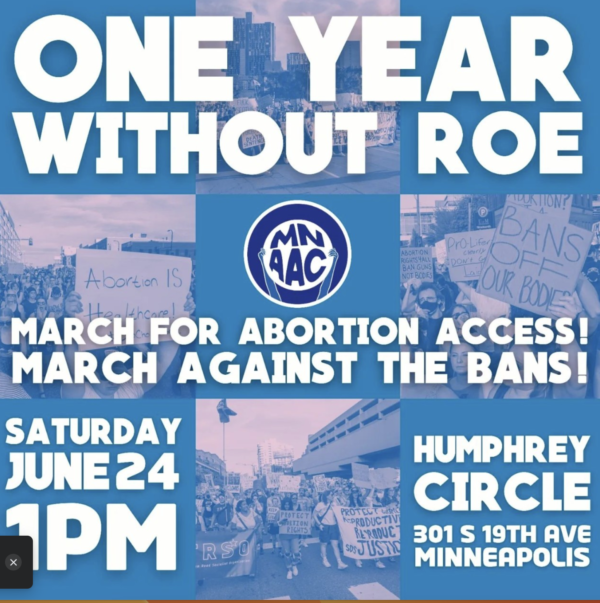 One Year Without Roe – March for abortion access! March against the bans! Saturday, July 8, 2023, 1 pm Mayday Plaza, 301 Cedar on the West Bank in Minneapolis (rescheduled…