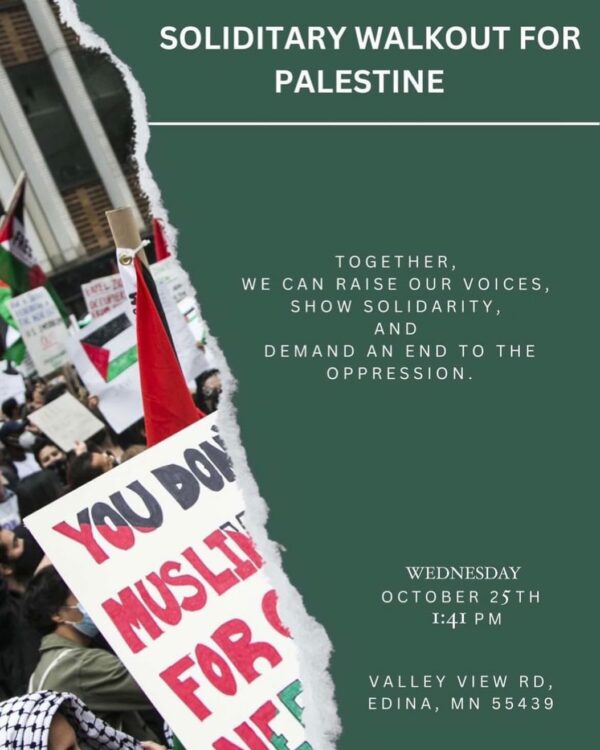 Wednesday, October 25, 2023 at 1:41 pm 6754 Valley View Rd, Edina, MN 55439 Students at Edina High School @ehswalkoutforpalestine will be participating in the national walkout on Wednesday, October…