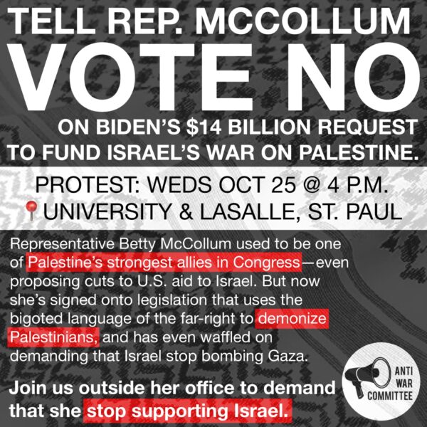 Wednesday, October 25, 2023 @ 4 p.m. Gather at intersection of Lasalle and University, St. Paul, MN (one block from Rep. McCollum’s office) McCollum, who represents St. Paul in the…