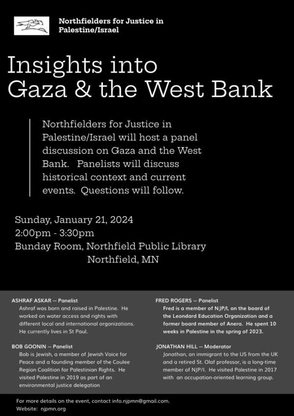 Sunday, January 21, 2024, 2:00 – 3:30 pm, Bunday Room, Northfield Public Library, Northfield, MN Initiated by Northfielders for Justice in Palestine/Israel NJP/I will host a panel discussion on Gaza…