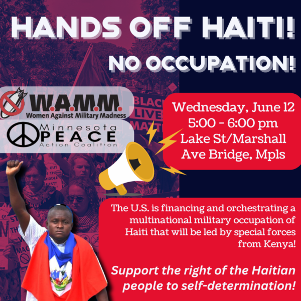Wednesday, June 12, 2024, 5:00-6:00 pm, Lake St/Marshall Ave Bridge, Minneapolis, MN HANDS OFF HAITI! No Occupation! The U.S. is financing and orchestrating a multinational military occupation of Haiti, that…