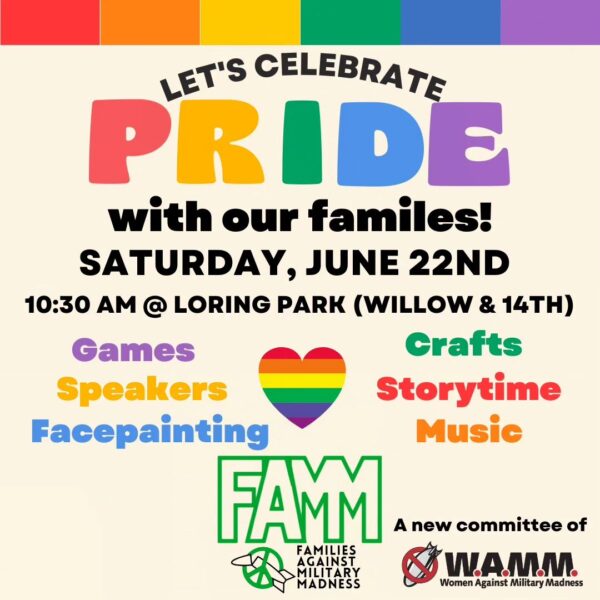 Saturday, June 22nd, 10:30am, Loring Park (Willow and 14th) 🌈✊️📣 Join Families Against Military Madness for a fun, educational, family-centered Pride action! Featuring music; games; facepainting; storytime; art projects; and…