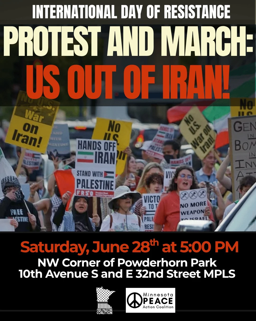 Saturday, June 28th, 5PM, North-West corner of Powderhorn Park, 10th Ave S and E 32nd St, Minneapolis 🇮🇷🚨ALL OUT AGAINST WAR! HANDS OFF IRAN! 🇮🇷🚨 ⚠️ Trump has bombed Iranian nuclear sites, bringing the U.S. into direct conflict with Iran and risking an open-ended, escalating war in the Middle East. People from all political backgrounds,…