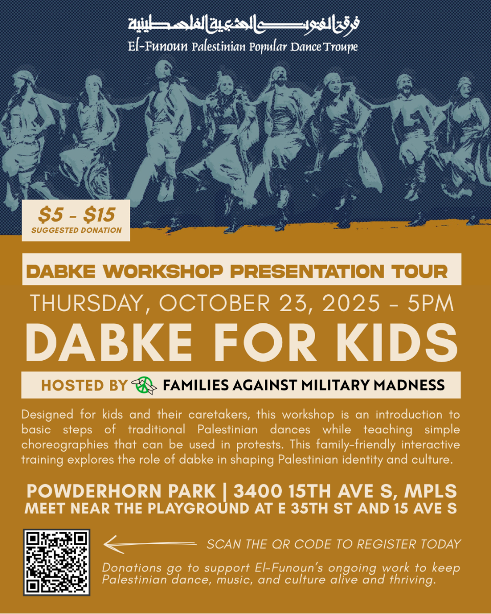 Thursday, October 23, 2025, 5 PM, Powderhorn Park, 3400 15th Ave S, Minneapolis, Meet near playground at E 35th St and 15th Ave S Join us on Thursday, October 23rd at 5 PM for an INCREDIBLE evening of dance! FAMM is proud to host Dancers from El-Funoun, the premier Palestinian dance group, for a “Dabke…