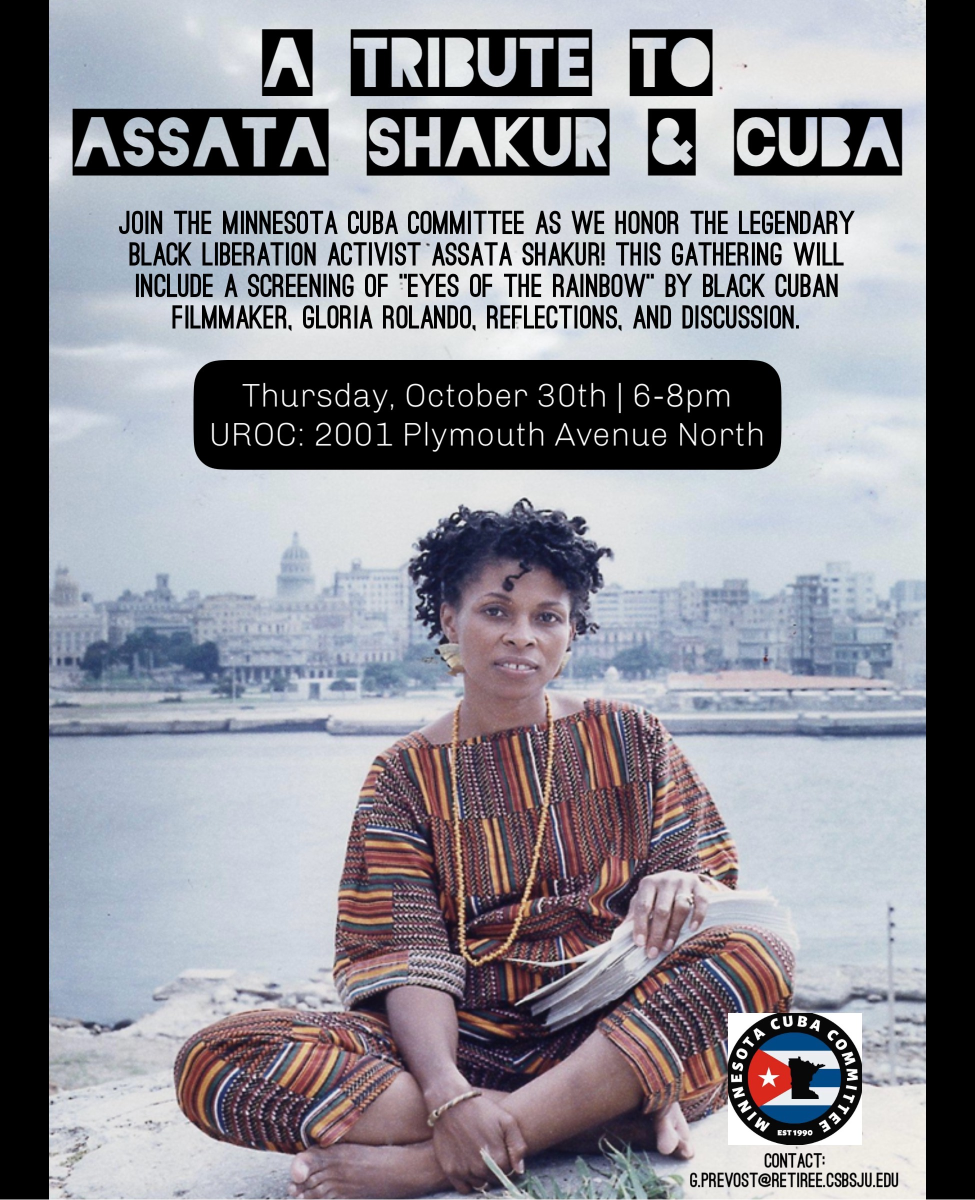 Thursday, October 30, 2025, 6-8 PM, UROC, 2001 Plymouth Ave N, Minneapolis, MN Join the Minnesota Cuba Committee as we honor the legendary Black liberation activist Assata Shakur! This gathering will include a screening of Eyes of the Rainbow by Black Cuban filmmaker, Gloria Rolando, reflections, and discussion. Contact g.prevost@retiree.csbsju.edu Organized by MN Cuba Committee, endorsed by…